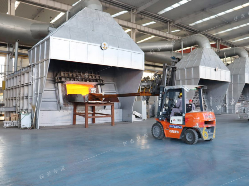 再生鋁雙室爐煙氣處理系統(tǒng)采用XLP高效旋風(fēng)除塵器+強(qiáng)制排風(fēng)冷卻器+脈沖布袋除塵器組成,雙室爐爐門排煙采用2個排煙罩,2個爐門罩交替打開;并配套爐膛排料輔助排煙系統(tǒng),1套雙室爐煙氣處理系統(tǒng)處理風(fēng)量≥130000m3/h。除塵器運(yùn)行后將雙室爐燃燒過程產(chǎn)生的高溫?zé)煔猓囟龋?50℃)和爐門罩排出的煙氣全部收集干凈,保證了工人的操作環(huán)境,達(dá)到了規(guī)定的排放標(biāo)準(zhǔn),給生產(chǎn)企業(yè)帶來了巨大的經(jīng)濟(jì)效益。除塵器收集的顆粒污染物主要是熔煉過程中產(chǎn)生的金屬氧化物和非金屬氧化物,還有大量碳粒灰份等,除塵脫硫后:煙塵濃度:≤10mg/m3。