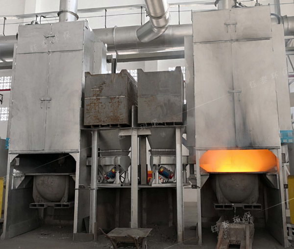將熔煉爐中鋁灰扒出,盛入鋁灰機專用的鍋中,通過設(shè)備攪拌,將比重不同的金屬鋁和熱殘灰分離。在對高溫鋁灰進行攪拌的這個過程是粉塵最為嚴重的時候,此時炒灰機配套的55KW除塵器需要滿負荷運轉(zhuǎn),以達到最佳除塵狀態(tài)。1套鋁灰處理煙氣處理系統(tǒng),單獨為炒灰機設(shè)置的除塵器,處理風量約為45000m³/h。
